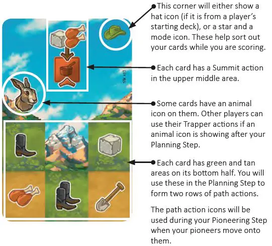 Move your frontiersman directly to the mountain base. If any other players' frontiersmen were also on the card, they also move their figures back to the mountain base, and receive a Pair of Boots token in compensation.