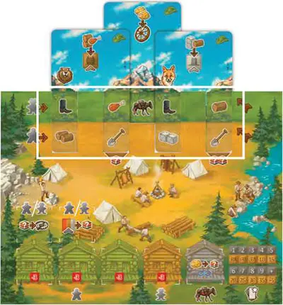 Place the cabins near the general supply, shuffle and stack them on the space shown on the left of the market board face-down, then draw 4 tiles and place them face-up on the market spaces.