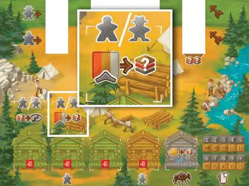 You may build a cabin tile from the cabin market board and add it to your player board during your Pioneering Step. Cabins have special rule-bending abilities, and prevent you from losing points at the end of the game (see Cabins and Scoring below).