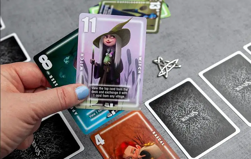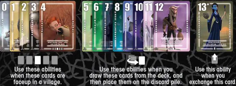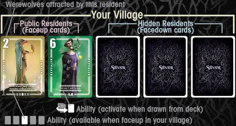 Second, each card displays a person with an ability. If a card is in your village, that person is a resident. Some residents help you when they live publicly in your village (low-numbered faceup cards).