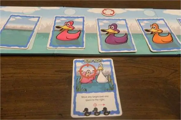 The target marker that is shot at is removed from the board. If a duck is shot at it is removed from the game and all of the cards in the duck line are moved one spot up to fill the empty spot.