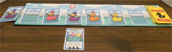 The other cards are shuffled with the "empty water" cards to form the duck deck. The top six cards from the duck deck are dealt out to the game board from left to right.