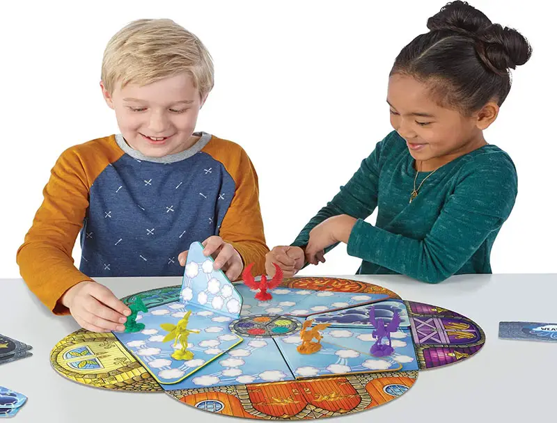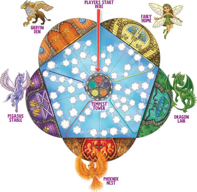 Familiarize all players with the five enchanted characters and their homes on the board. Place the 5 character movers in the center of the board on Tempest Tower on their corresponding colored spaces.