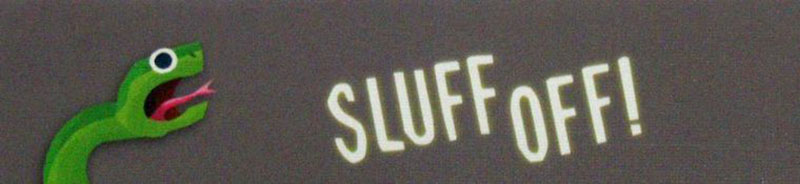The gameplay for Sluff Off! follows the standard trick-taking formula: The cards are numbered 1-15 in five different suits, and blue is always trump. If someone leads a color, you must follow suit if you can; otherwise, you can throw off a card or trump the trick.