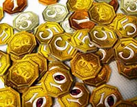 Give each player five victory coins (of 1). Place all remaining coins, including all "3"s, "5"s and "10"s next to the board. These coins will serve as your currency during the game, and help determine the winner at the end.