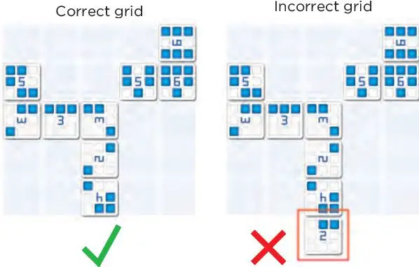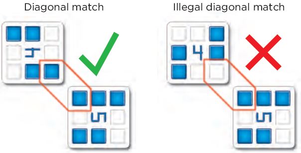 Anywhere the new card touches another card on the table, the boxes facing one another must match - empty box to empty box, colored spot to colored spot (including the diagonally positioned boxes).