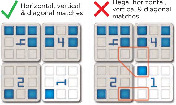 These two examples show legal and illegal horizontal, vertical and diagonal matches.