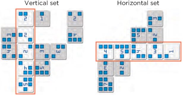 When a player places a card such that a line of 5 cards (horizontal, vertical or diagonal) is formed, this is a set. The player then collects all the cards that form the set.
