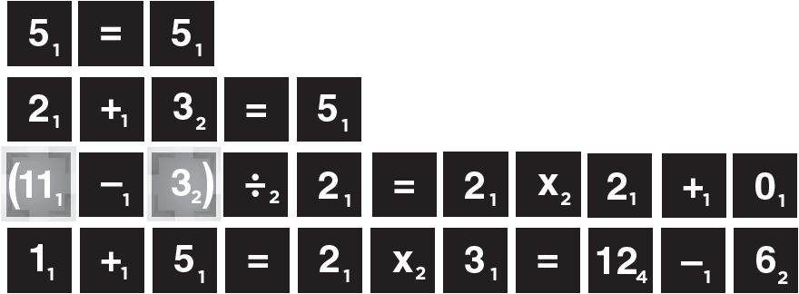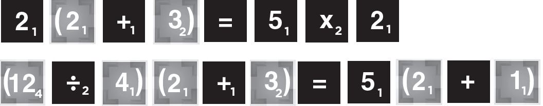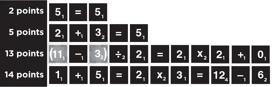 Note: Equations are read from left to right or from top to bottom. Each tile has a point value marked in the lower right corner of the tile.