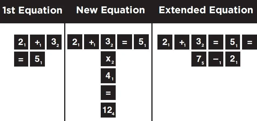 The player to the left goes next. This player must make a new equation using one of the tiles from the first equation. This can be done in two ways: a new equation can be formed, or the first equation can be extended.