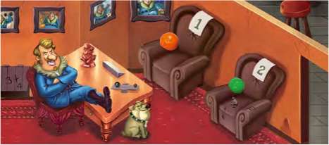 Important: In a 2-player game, only the armchair marked with a "1" is occupied by a sphere. The player who has the smaller sphere must place it in the junk room.