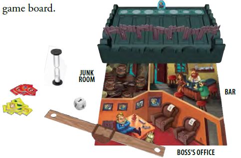 Place the game board in front of the rolling track. Three rooms are depicted on the game map: the junk room, the bar, and the boss's office.