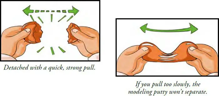 To detach a portion of the modeling putty, hold the modeling putty with both hands and yank the desired portion off. If you do this too slowly, the modeling putty becomes stringy as if it were chewing gum. If this happens, simply try it again.