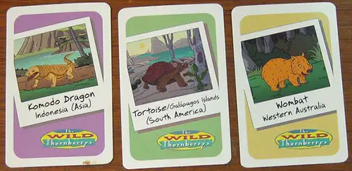 The Animal Photo Cards all have colored backgrounds that match the continent where each animal lives. Place the cards picture side up with blue (North America), teal (Europe) and pink (Asia) borders above the matching colored continents at the top of the board.