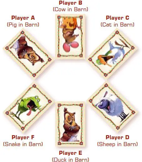 Player E, who has a duck in the barn, already has an owl card on top of his or her stack of table cards. Since their cards match, Player A races to say "quack" before Player E says "oink".