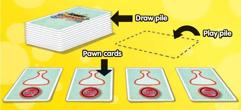 Each take all 4 pawn cards of one color. Lay them out in front of you with the START side showing. Put any spare pawn cards to one side.