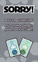 Play these to block SORRY! cards played on you. You're saved! Nobody can play a SORRY! or Don't be SORRY! card onto your Don't be SORRY! card.