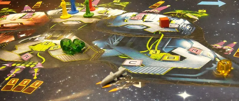 To repair the malfunction, players can perform action C in either of the two locations. If players do at least one such action in each location in a single turn, the malfunction receives one extra red block at the end of the Player Actions step.