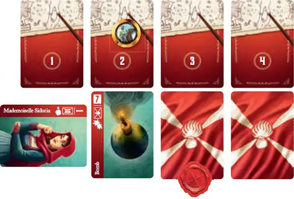 (If you activated your Bomb during the round and also correctly identified the next enemy card, pick two cards for your opponent to place in their exhausted pile in the next round instead of one).