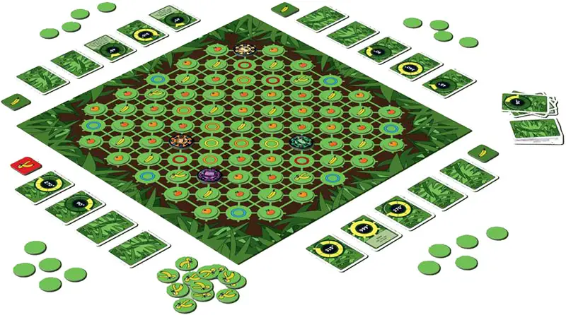 When only one type of fruit is left in the arena (not counting banana peels), the game is immediately over. The players turn over their fruit tokens and count up their hauls.