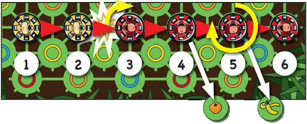 The red monkey spins randomly from the impact, so she draws a card from the deck and rotates 90 degrees clockwise. Then the red monkey assumes the remaining five junctions of the yellow monkey's movement.