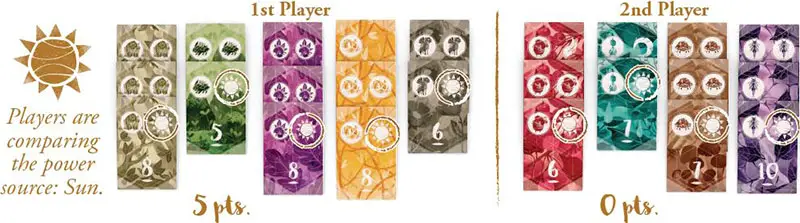 The player with more power source icons for a particular power source scores nature points equal to the amount of icons the player has. All other players score no points.