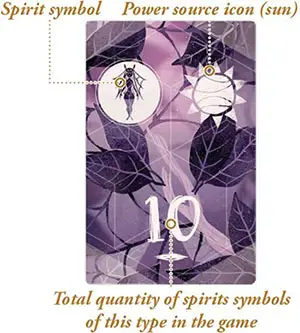 Each spirit tile has one or two icons at the top that are either a spirit symbol or one of three power source icons - the ferocity of fire, the mysticism of the moon, and the life-giving power of the sun.