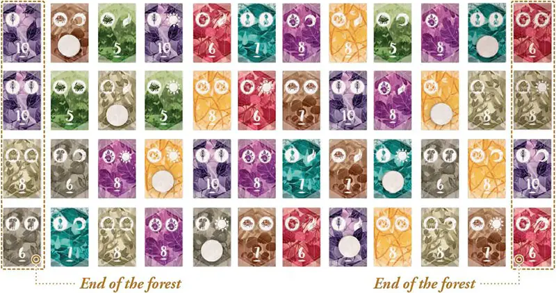Shuffle the 48 spirit tiles and deal them face up in four rows of12 tiles to the center of the table to create the forest.