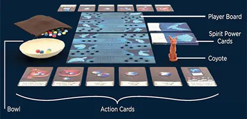 Coyote is a trickster who loves distracting other animals. If the Coyote pawn is on one of your animals, you are not allowed to add any stones (including Spirit Stones) to that section until Coyote moves. There are two ways to get rid of Coyote: