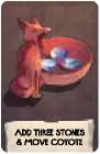 Add three stones & move coyote - Draw three stones from the bag and add them to the bowl. Then, place the Coyote pawn on one of the animals on your opponent's board. You do not have to move Coyote if you don't want to.