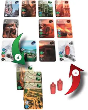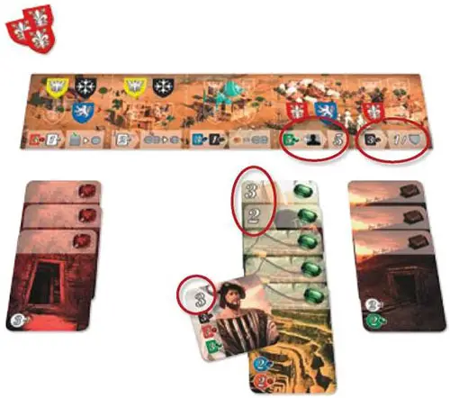 At the end of your turn (immediately after the possible visit from a noble), if you meet the requirement c of a power d, place one of your coats of arms right above it, on its allocated space.