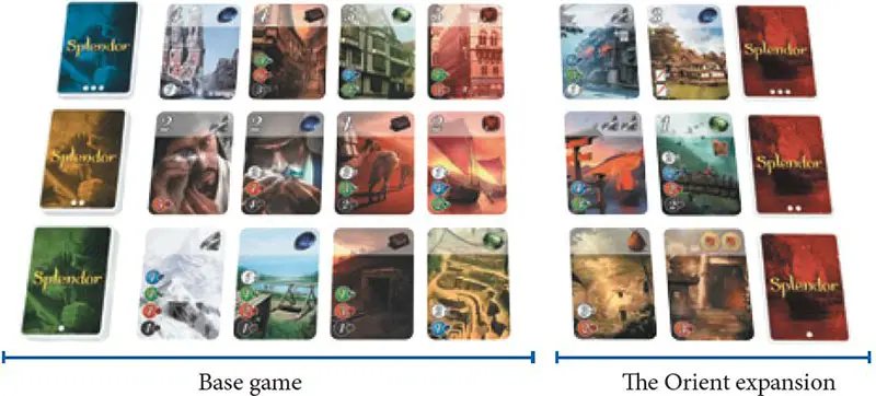 Replace any purchased or reserved card with a card from its matching deck. Therefore, at all times during the game, there must be 4 base game cards and 2 Orient cards of each level face-up (unless the deck in question is depleted, in which case the empty spaces remain as is).