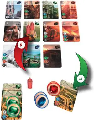 To purchase one of these cards, you must discard 2 bonuses of the indicated color that you previously acquired (put them back in the box).