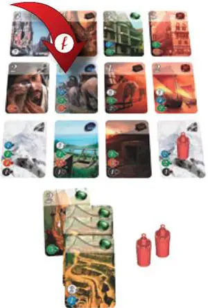Shuffle the 10 new level 1 cards (O), reveal 2 of them, and place them to the right of the base game cards. Then place the 8 remaining Orient cards in a deck to the right.