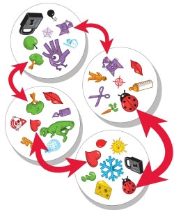 Look for the identical symbol between the two cards (same shape, same color, only the size can be different). The first player to find the right symbol names it out loud and draws two new cards which are then placed face-up on the table.