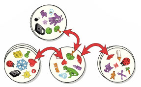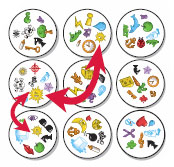 The first player to find the symbol names it, takes the card from the draw pile and places it in front of him or her, on top of his or her card. By taking this card, a new card is revealed.