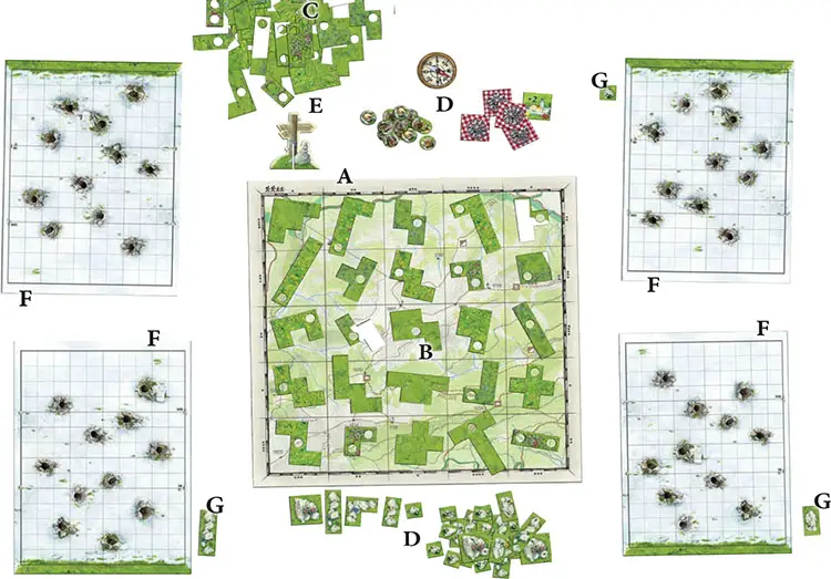 D Place the Rock tiles, Marmots, Picnics / Hiking Pins, and Compass within reach of the players in a common supply.