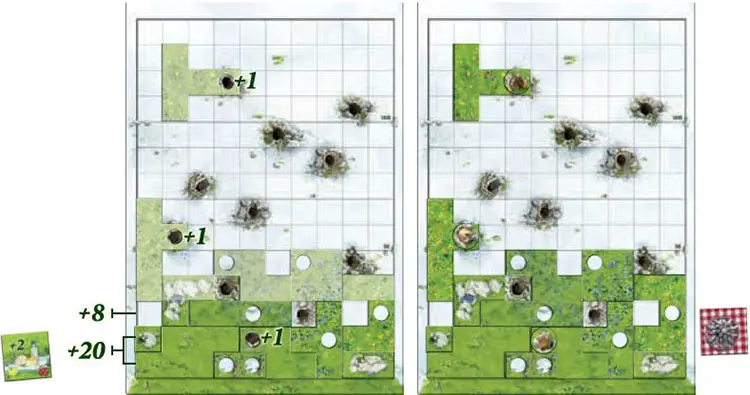 Pay attention to the Holes in the Meadow tiles and the Burrows on your Mountain board. Burrows will challenge your puzzle skills and placing adjacent Holes will allow you to place extra Rock tiles on your Mountain board.