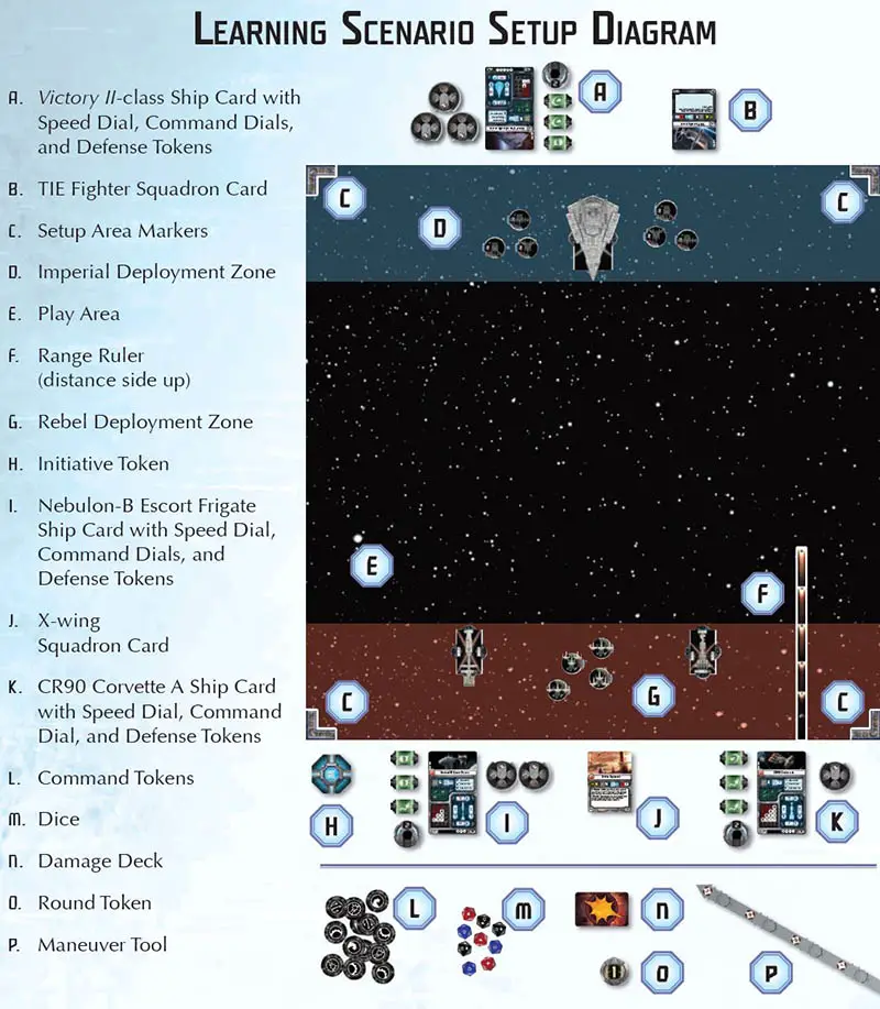 For the first game of Star Wars: Armada, players are encouraged to play the learning scenario. This scenario is designed for new players to quickly set up and play a game using only the essential components and rules.