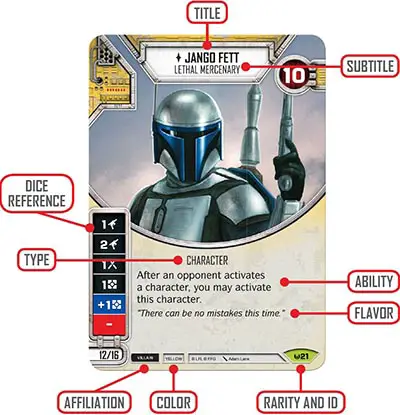 All cards may have the following components: affiliation, color, type, title, ability, uniqueness, flavor, identification, rarity, and dice reference.