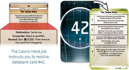 The databank card lists a series of steps you must perform to complete the job and gain your reward. Read the card aloud, starting with step #1 and stopping if you are required to perform a test or fight a combat.