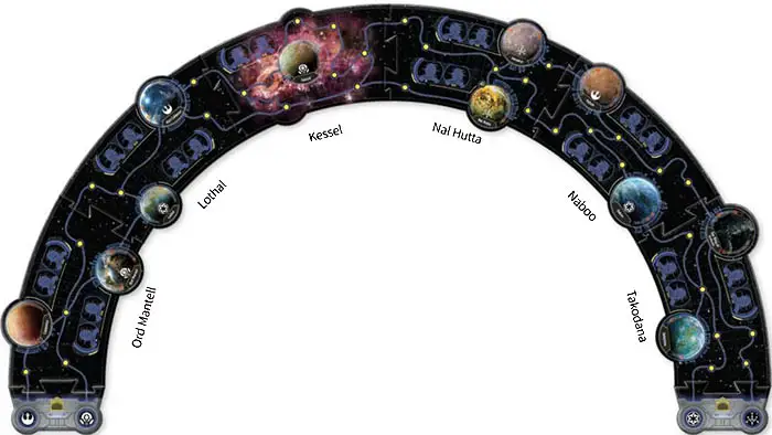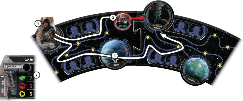 1Jyn Erso is on Ryloth and wishes to move to the Ring of Kafrene during her planning step.2Her ship has a hyperdrive value () of 7, and the Ring of Kafrene is 4 spaces away.