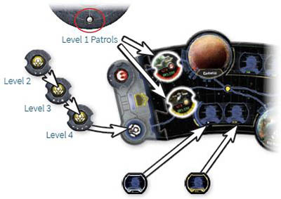 Set Up Patrol Tokens: Sort the patrol tokens by level (the white dots on the back of the tokens). Place each level-1 token faceup on the navpoint space (yellow circle) adjacent to the endcap space that has a matching faction icon.