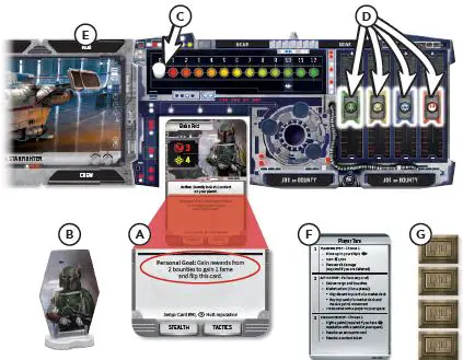 a1 character card with "Personal Goal" side faceupb1 character standee matching their chosen characterc1 player board with a plastic fame marker in the "0" space of the fame trackd4 reputation tokens (1 of each faction). Place them on the reputation tracks of the player board, covering that faction's icon.e1 starter ship sheet, flipped to the side of their choice (either the G9 Rigger or the G-1A Starfighter)f1 reference cardgCredit tokens (the amount varies). Starting with the first player and proceeding clockwise, players receive: 4,000 credits, 6,000 credits, 8,000 credits, and 10,000 credits.