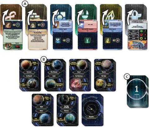 aSeparate the market cards into six different decks according to their card backs. Shuffle each deck and place them facedown in a row below the map. Then reveal the top card of each deck and place it faceup on the top of its deck.bSeparate the encounter cards into seven different decks by card back. Shuffle each deck, and place them facedown next to the map, near their corresponding planets.cKeep the databank deck in order, within easy reach of all players.dKeep the unused ship sheets in a pile out of the way. This is the supply of unused ships, and players will be able to acquire these ships during the game.