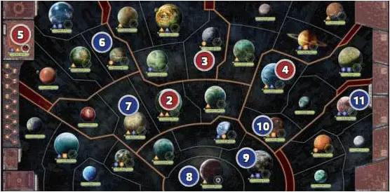 1, the system's name2, space area surrounding it3, and its borders4. Ground units in the system are placed on the planet art, while ships are placed in the space area around the planet.There are eight regions of the game board, separated from each other by large orange borders. Each region contains four systems.