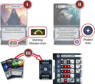 Projects: Project cards are missions that have a white star in the bottom-right corner of the card. The Imperial player takes the project cards and shuffles them together. Then he places this deck on the "Project" space of the game board.