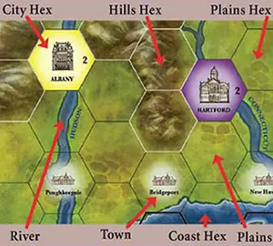 The maps are divided into hexagonal spaces (called "hexes"). Each hex shows either plains terrain (print- ed green), hills or mountains (printed brown), coast (green & blue), or a city (a named and colored hex). Occasionally the hex contains a river (a blue line) or a town (town symbol).