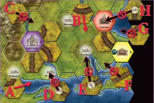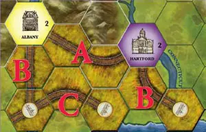 During the game, players build railroads by placing hexagonal track tiles (track) onto the map, connecting towns and cities in the process. Each section of track that connects a city to a city (see A in the diagram to the right), town to a city (see B's), or town to a town (see C) is called a "link".