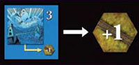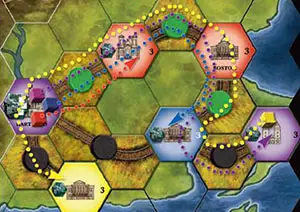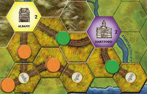 A New City tile can replace a town tile already on the board, or it can be placed directly on a hex containing a town. Each new city opens up new opportunities for the railways and supplies extra Goods cubes.